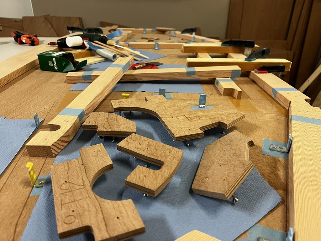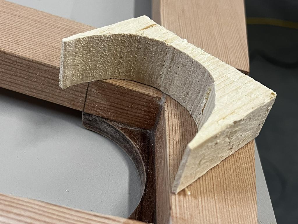 Ja, ich bin immer noch am Frames (Spanten) basteln. Immerhin, die dazu notwendigen Teile auf dem Gestell werden weniger, dafür nimmt die Menge an Erfahrungen und Erkenntnissen zu. Nach dem Werkstattgeplauder Ende Januar waren erst einmal Nachbearbeitungen angesagt. Diskreten Hinweisen meiner hochgeschätzten Bootbau-Kameraden folgend legte ich die bereits vermeintlich fertiggestellten Teile noch einmal auf den Tisch und widmete mich einerseits den Leistenkanten – tatsächlich, die sehen abgerundet gefräst viel besser aus – und andrerseits den Hohlkehlen, die sich jetzt in nachbearbeitbarem Zustand befinden. All diese neuen Erkenntnisse und Techniken flossen und fliessen natürlich in die künftige Produktion ein, so dass ich bei der nächsten „Inspektion“ hoffentlich mit Lob und Anerkennung überschüttet werde. Oder so. Jedenfalls arbeite ich derzeit am 6. von total 8 Frames und liege somit im Zeitplan.